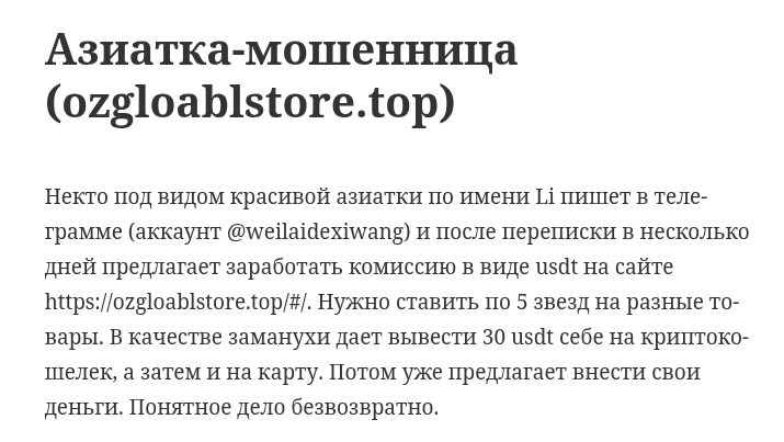 Далее, когда первичный контакт установлен, Li плавно переходит к делу. Она рассказывает о «простой и прибыльной» работе, которая не требует никаких навыков. Суть задачи – заходить на сайт ozgloablstore top и проставлять 5-звездочные рейтинги разным товарам. Легенда гласит, что это якобы помогает продвигать продукцию, а за такую «помощь» платформа щедро платит комиссионные.