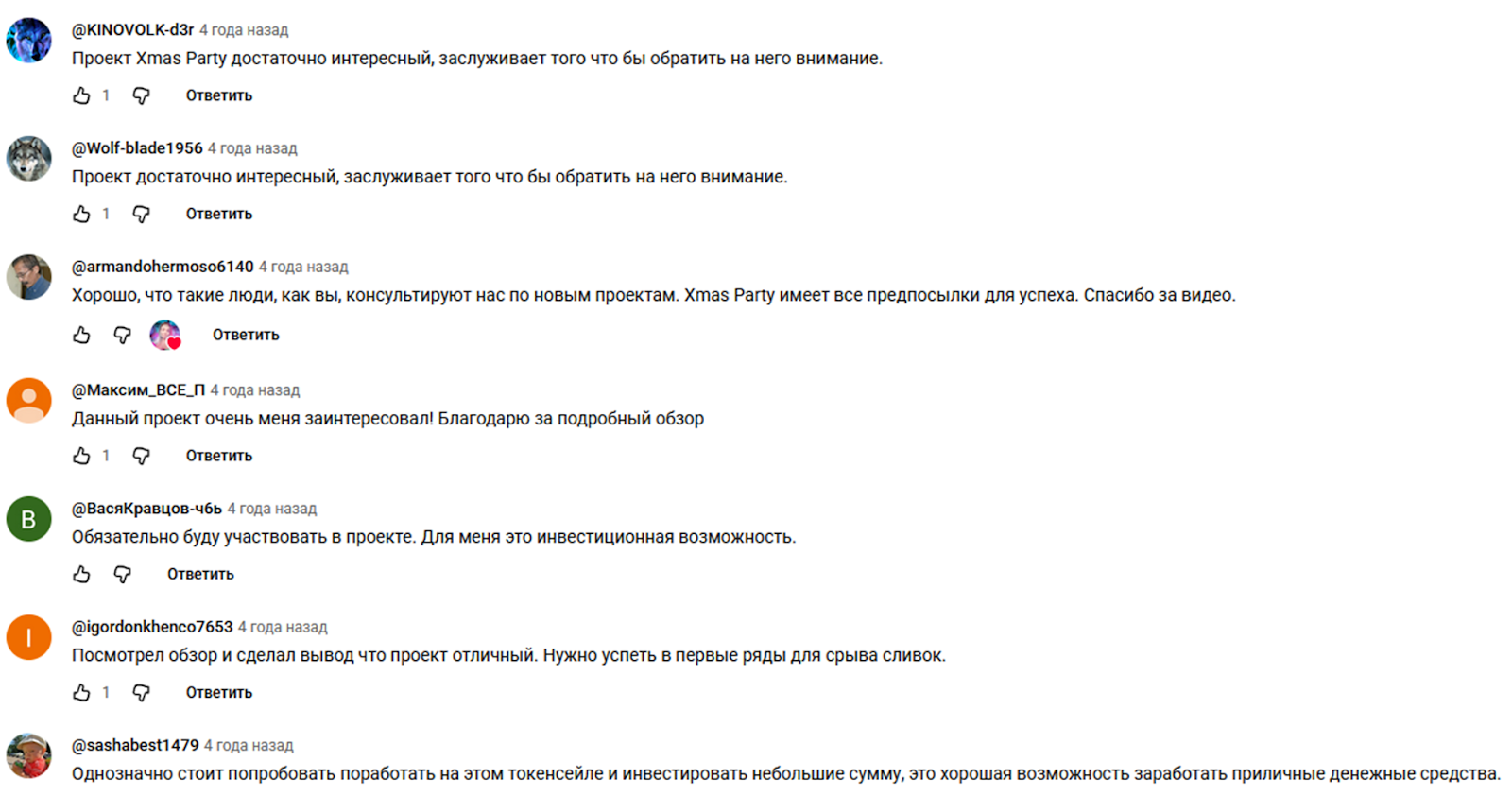 В сети нет независимых отзывов об игре Xmas Party. Не удалось найти ни одного комментария об успешном инвестировании и получении заработка. Сайт проекта закрыт, в сети Х посты и отзывы удалены.Единственные упоминания о проекте сохранились на РуТубе и Ютубе. Это несколько обзоров, которые хвалят игру и рассказывают, что она дает возможностью получить хороший доход. Но большинство комментариев под такими видео имеют явно заказной характер. Все они говорят, что проект является отличной «инвестиционной возможностью» и «предпосылкой к успеху». Но отзывов о том, удалось ли получить хоть что-то, нет.