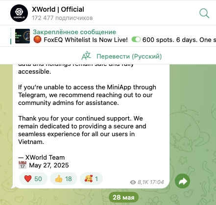 У проекта есть телеграмм-канал. Он называется XWorld Official и находится по аналогичному адресу.