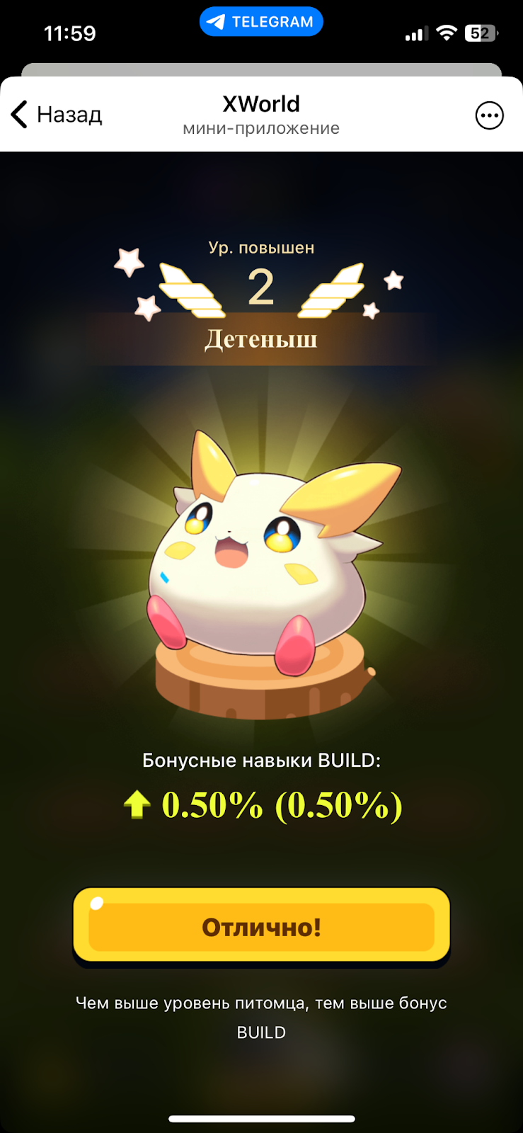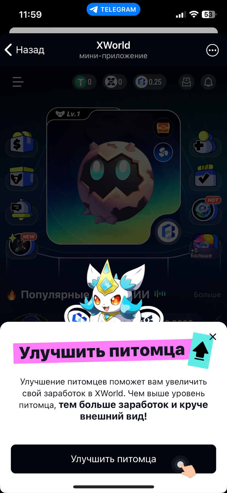 Питомцев можно и нужно улучшать. Система сама будет предлагать это периодически делать, сообщая о возможности апгрейда через модальное окно.