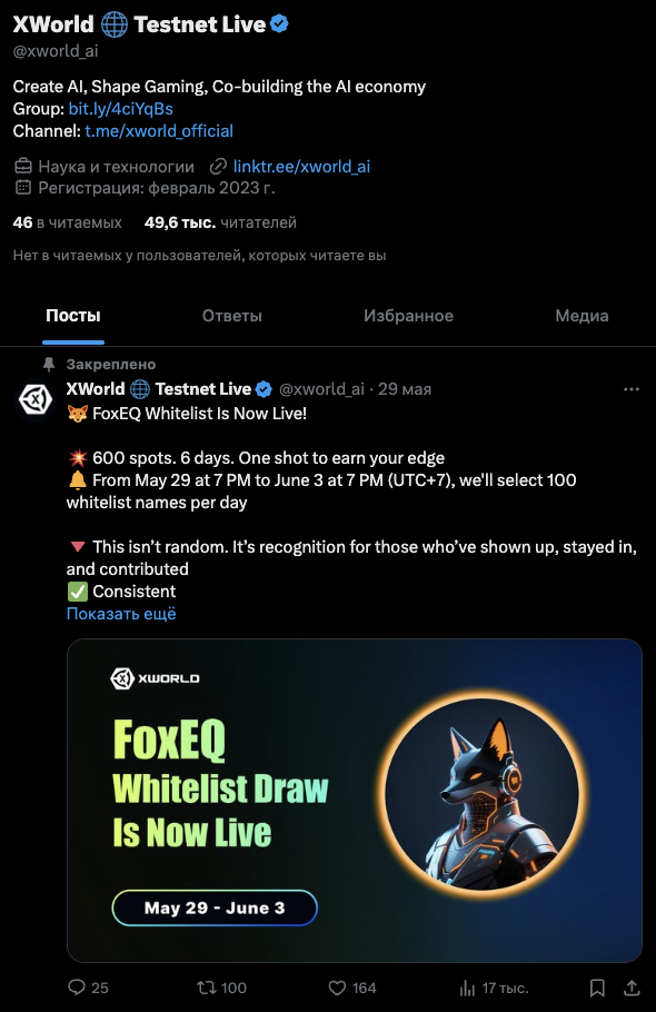 Есть у разработчиков и страница в Twitter — XWorld Testnet Live, xworld ai. На нее подписано около 50 тысяч читателей. Выложенная 29 мая и закрепленная публикация за трое суток нахождения в ленте получила 17 тысяч показов.