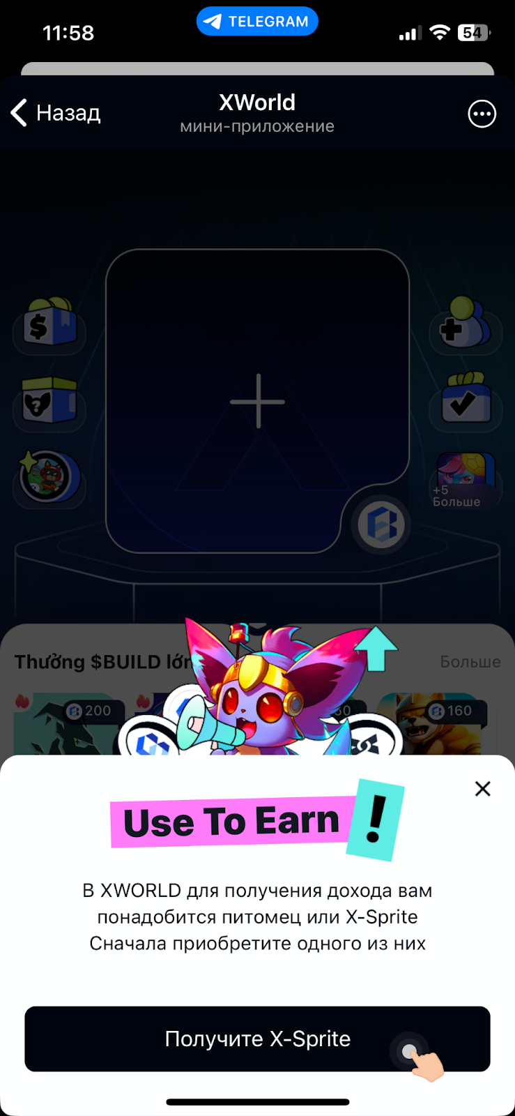 Питомцы в «ИксВорлд бот» генерируют доход в пассивном режиме. Чтобы заклеймить награду, нужно нажать на значок, который расположен справа внизу под его изображением.