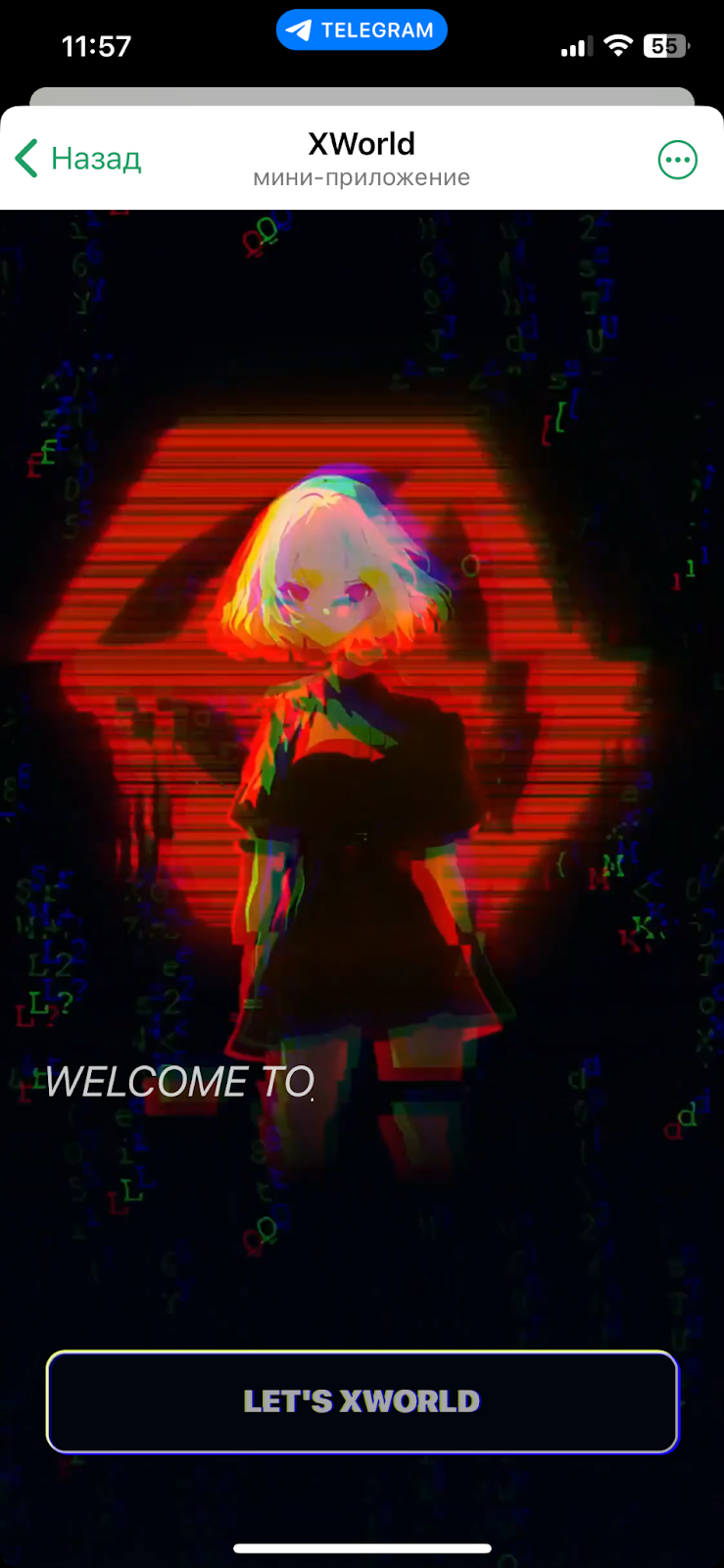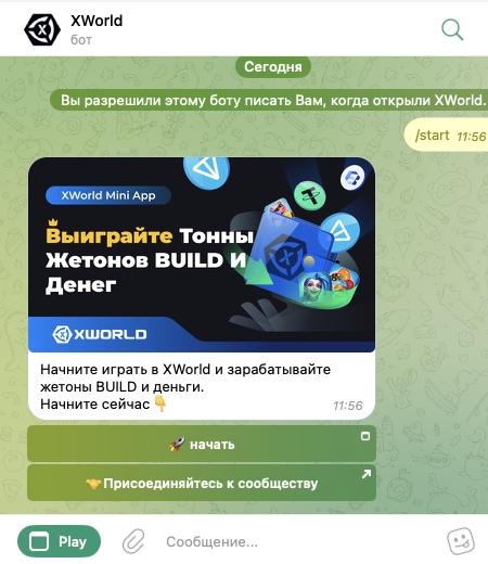 XWorld — это crypto-приложение, для запуска которого нужно воспользоваться ботом xworld x bot. После того, как оно будет активировано, в чат поступит велком-месседж.