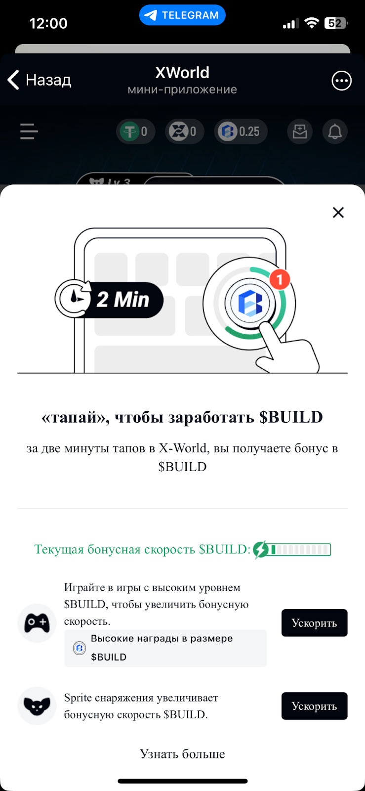 За монетки $BULD пользователь может ускорить процесс фарминга. Для этого нужно тапнуть на кнопку клейма, когда необходимое для сбора количество наград еще не накопилось. После этого в отобразившемся модальном окне нужно выбрать подходящий буст.