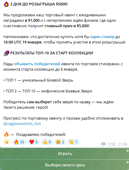 Команда Zargates Limited активно продвигает ивенты, за прохождение которых можно получить бонусы. В сообщениях указаны турниры и промо-активности с призовым фондом в $3000, $2180 и регулярные раздачи по $1000 в день, а также финальный приз $5000. Ключевое условие участия — торговля или покупка предметов на сторонней площадке Getgems и активность вокруг GiftBox и StickerBox.В канале с анонсами используется агрессивная риторика роста стоимости коллекций. Публикуются заявления о повышении флор-цены GiftBox и росте коллекции «x11». Это подталкивает аудиторию к спекулятивной модели поведения. По факту это стимулирование спроса на цифровые предметы через FOMO, что является рискованным подходом. Ценность таких активов держится на маркетинге и ликвидности, а не на фундаментальной ценности.