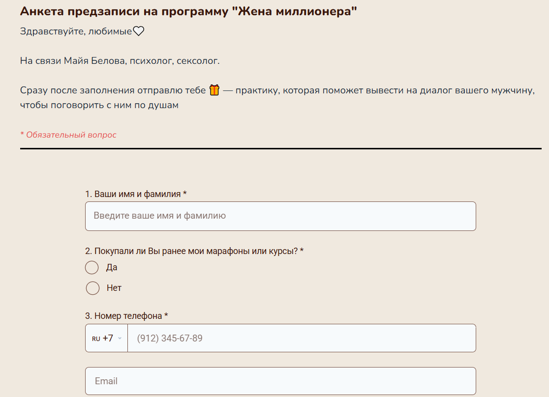 Отдельный акцент Майя Белова делает на идее, что женщина может влиять на успех мужчины и его доход, если будет вести себя определенным образом. При этом точные условия участия, формат обучения и гарантии результата заранее раскрываются не полностью. Для записи нужно заполнить анкету с личными данными, после чего уже предлагается дальнейшее взаимодействие.