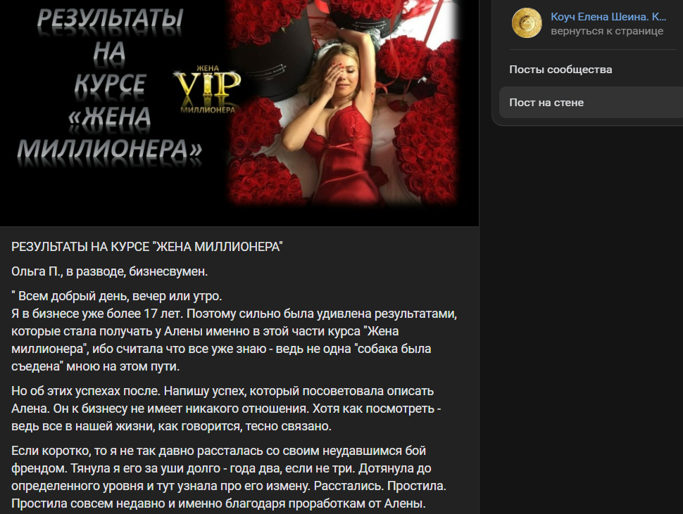 Отзывы про курс «Жена Миллионера», который впустила Мая Белова, можно найти в основном среди социальных сетей, связанных с профилем самого коуча. Так, в ВК она продвигается через тематические паблики за счет якобы реальных историй от женщин, которые изменили жизнь к лучшему после обучения.
