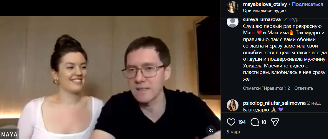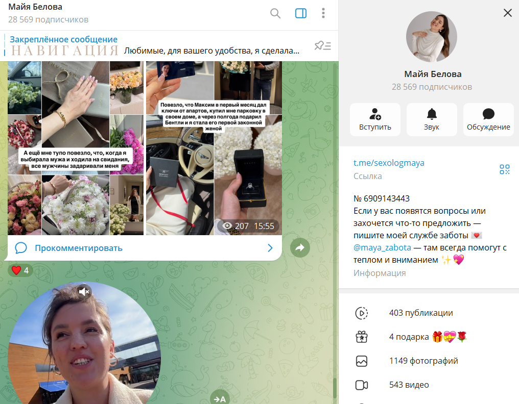 Майя позиционируется как психолог и эксперт по отношениям. При этом в открытом доступе о ней минимум конкретики и нет подтвержденных регалий, дипломов или детальной биографии. В основном все строится на создании личного бренда и образа счастливой женщины рядом с успешным мужчиной. Это все автор транслирует в соцсетях, в частности, Телеграмм и Инстаграм, через которые и продвигает рекламу обучения.