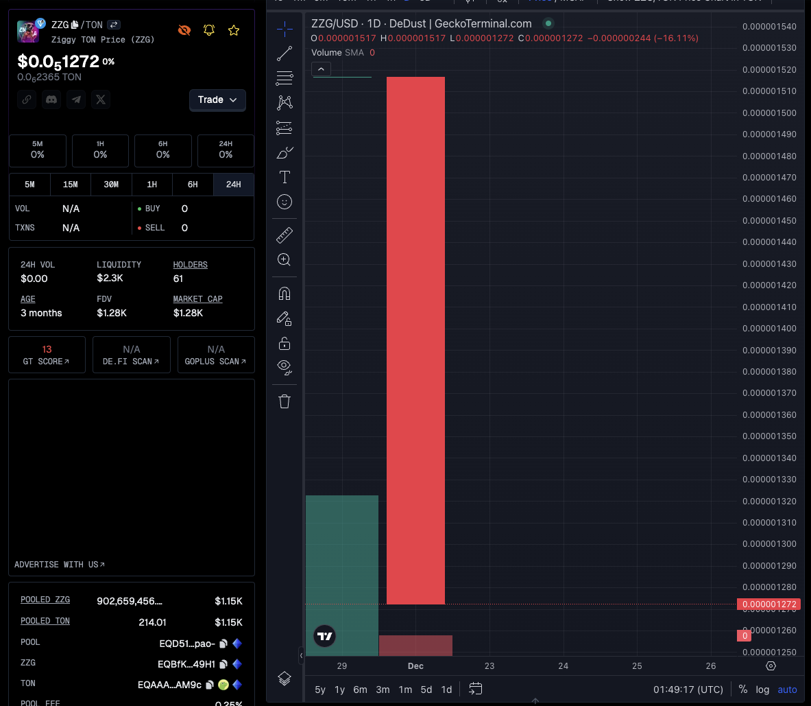 Цена токена Ziggy, на 25 декабря 2024-го года, составляет $0,0000012. Капитализация криптовалюты – около 1,4 тысячи долларов.