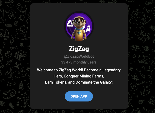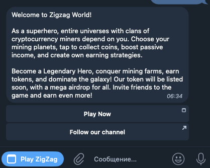 Чтобы начать играть, требовалось зайти в телеграмм-бот ZigZagWorldBot. После его активации в чат до сих пор поступает сообщение с кратким описанием проекта.