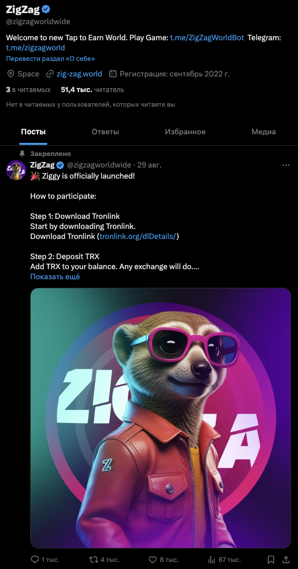 Страница команды основателей в Twitter – zigzagworldwide. На нее подписано 51,4 тысячи читателей. Выложенный 29 августа и закрепленный пост был показан около 67 тысяч раз.