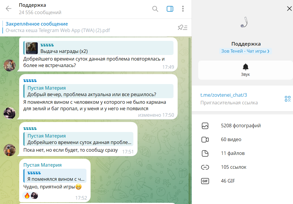 У проекта «Зов Теней» есть отдельный чат, где пользователи могут задавать вопросы и получать поддержку от разработчиков, а также следить за новостями, бонусами, апгрейдами и историями игроков.