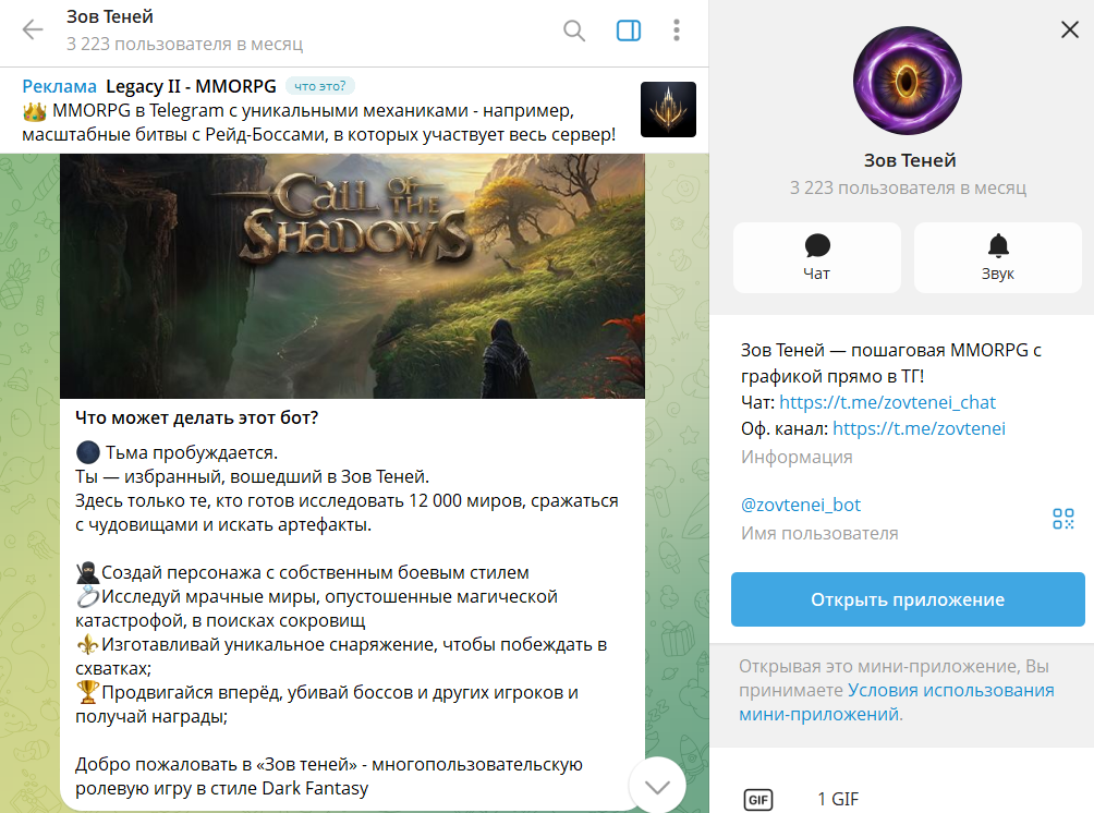 В «Зов Теней» играют прямо в Telegram, ведь сервис не требует скачиваний.