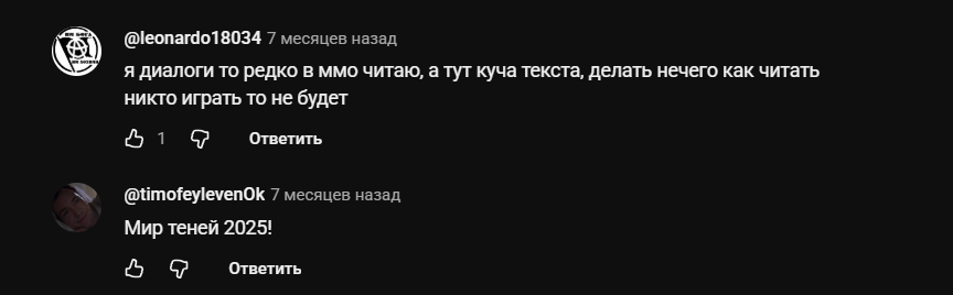 Также на Ютубе уже есть множество разборов этого проекта, но комментарии под ними появляются редко. Так, например, можно заметить, в таких отзывах об игре в Телеграм «Зов Теней», что пользователям не особо нравится много текста во время игрового процесса. Судя по мнениям людей, это отвлекает их от сюжета и погружения в геймплей.