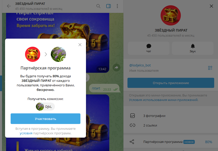 Игра Звездный пират функционирует исключительно внутри Telegram. Отдельного сайта с юридической информацией, данными о компании-операторе или публичной офертой на момент проверки не представлено. Вся навигация, начисления и операции проходят через бот @lodjelco bot. На момент проверки в нем отображается 45 450 активных пользователей в месяц, но это число длительное время остается неизменным.