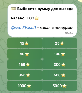 Для вывода денег из сервиса нужно накопить на балансе сумму от 15 Telegram Stars. После этого потребуется перейти в раздел «Вывести звёзды» и проследовать предложенным в нем инструкциям.