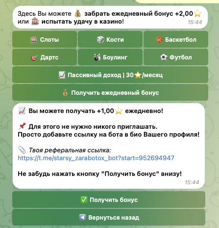 Пользователям предлагают вариант пассивного заработка, который предполагает добавление реферальной ссылки на бота в свой тг-профиль. За это обещают выплачивать по звезде в сутки.