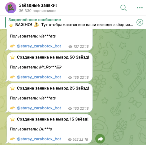 На телеграмм-канал «Звёздные заявки», размещающийся по адресу vivodiVashi1, на 5 марта 2026-го года, подписаны 36,33 тысячи пользователей. Публикации в его ленте получают в среднем по 130-170 показов. Комментариев и реакций под постами нет.Весь контент на ТГК — это сообщения от бота. Он уведомляет о том, что какой-то пользователь вывел определенное количество звезд из сервиса для заработка.