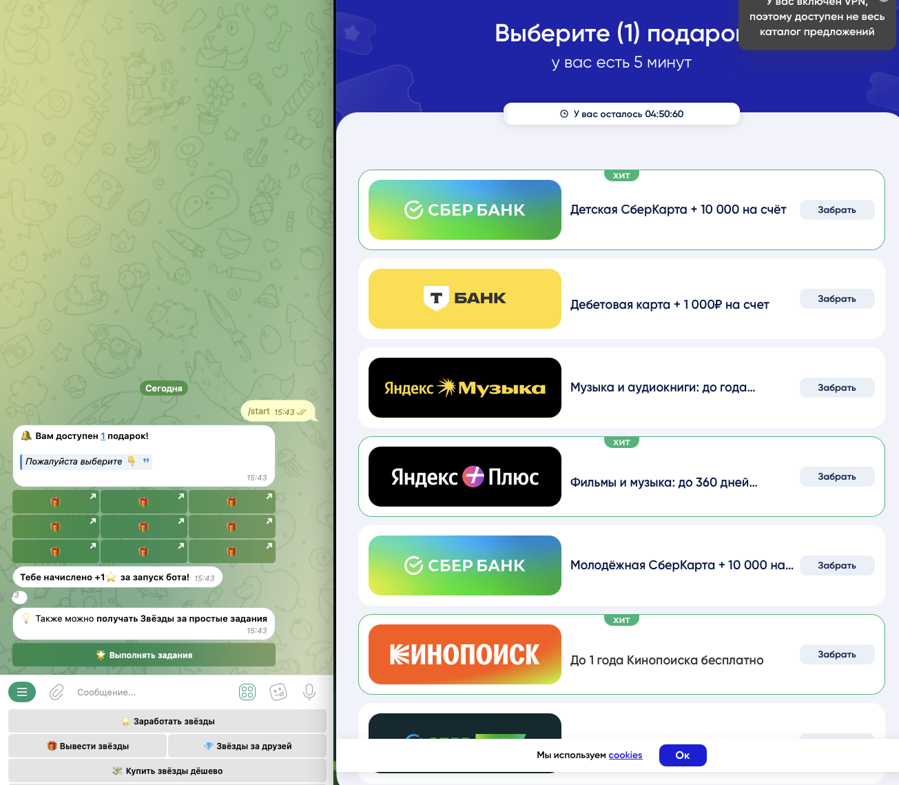 После активации тг-бота в его чат поступает сообщение с предложением забрать подарок. Приз предполагает бесплатные подписки и бонусы на различных сервисах. То есть организаторы проекта стремятся заработать на реферальных программах различных интернет-платформ.