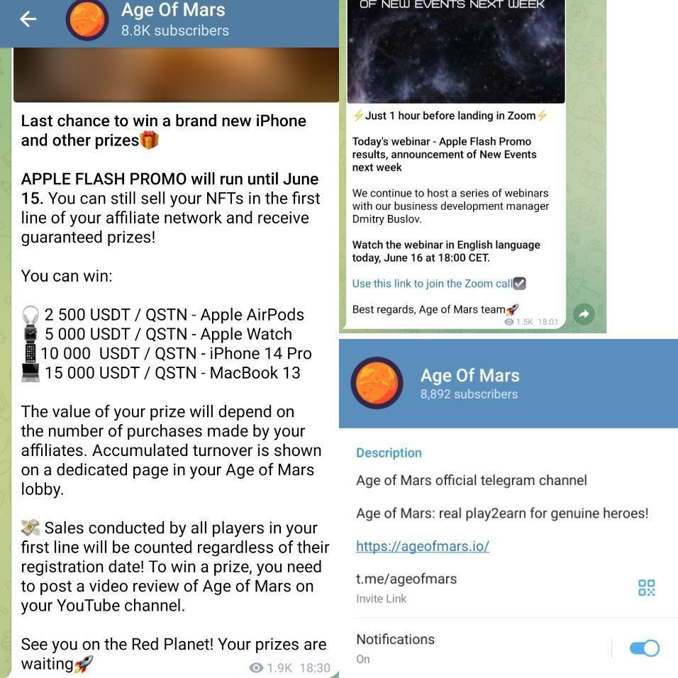 Age of Mars game имеет канал в Телеграмме. Его поддерживают 8.8 тысяч подписчиков. Из них просматривают посты 1.5-3k. Комментирование закрыто, поэтому можно лишь просматривать информацию. Весь контент в основном посвящен новостям игры. Админы публикуют: