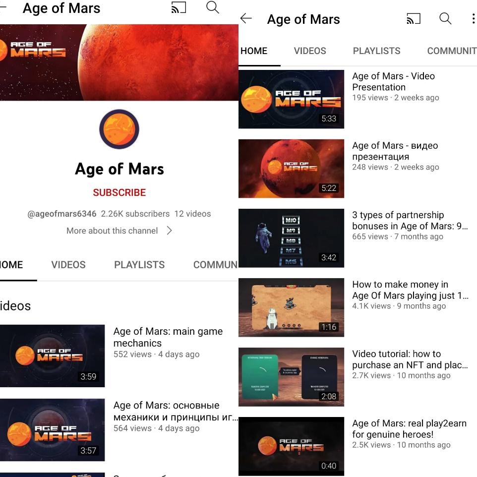 Помимо Telegram канала, Аге оф Марс делиться новостями и на платформе YouTube. Здесь насчитывается 2.26к подписчиков и всего 12 видеороликов. Авторы выкладывают основную механику и принцип работы игры. Помимо этого, регулярно публикуются ближайшие вебинары.