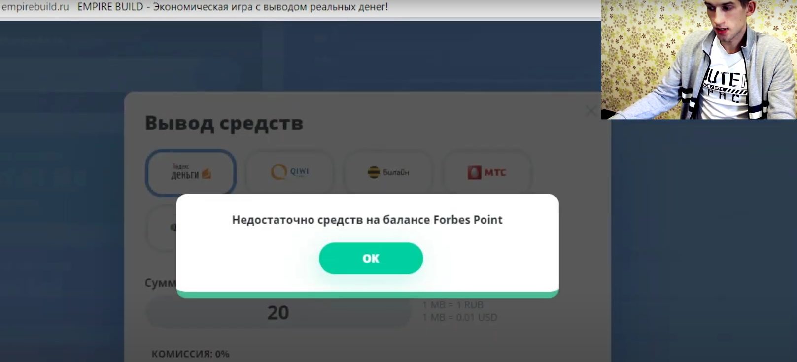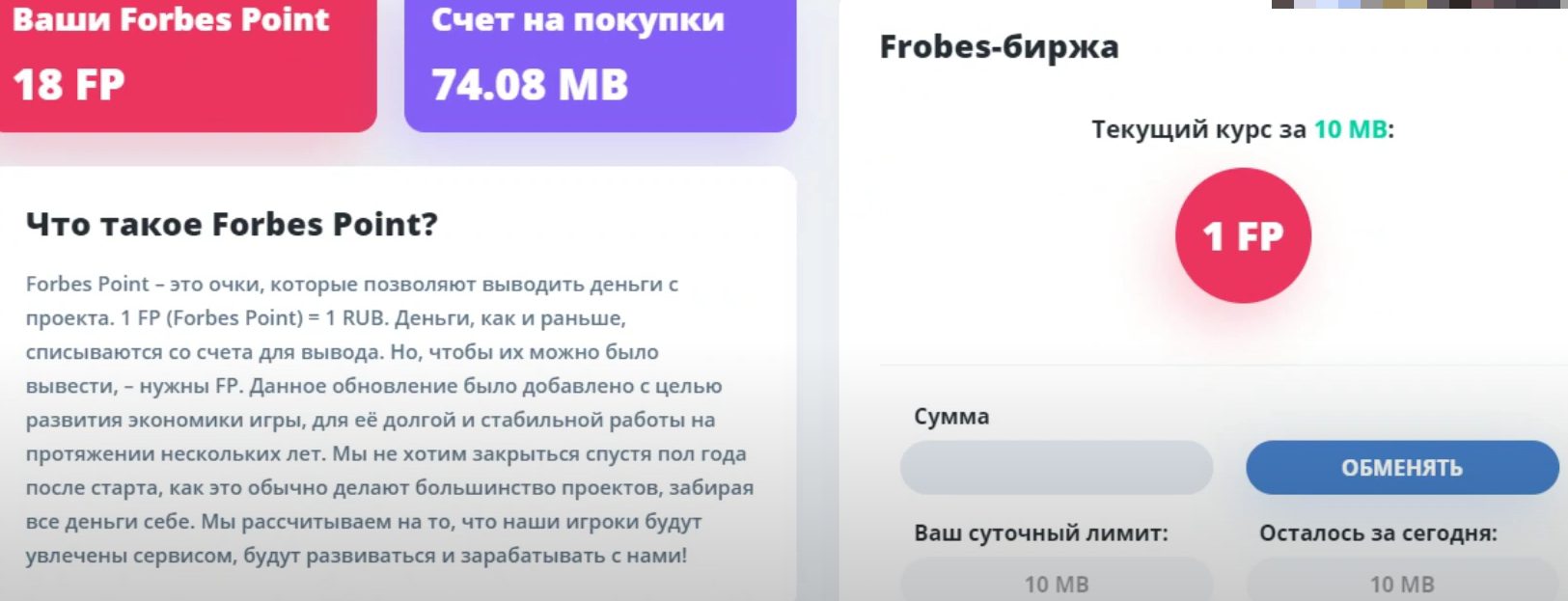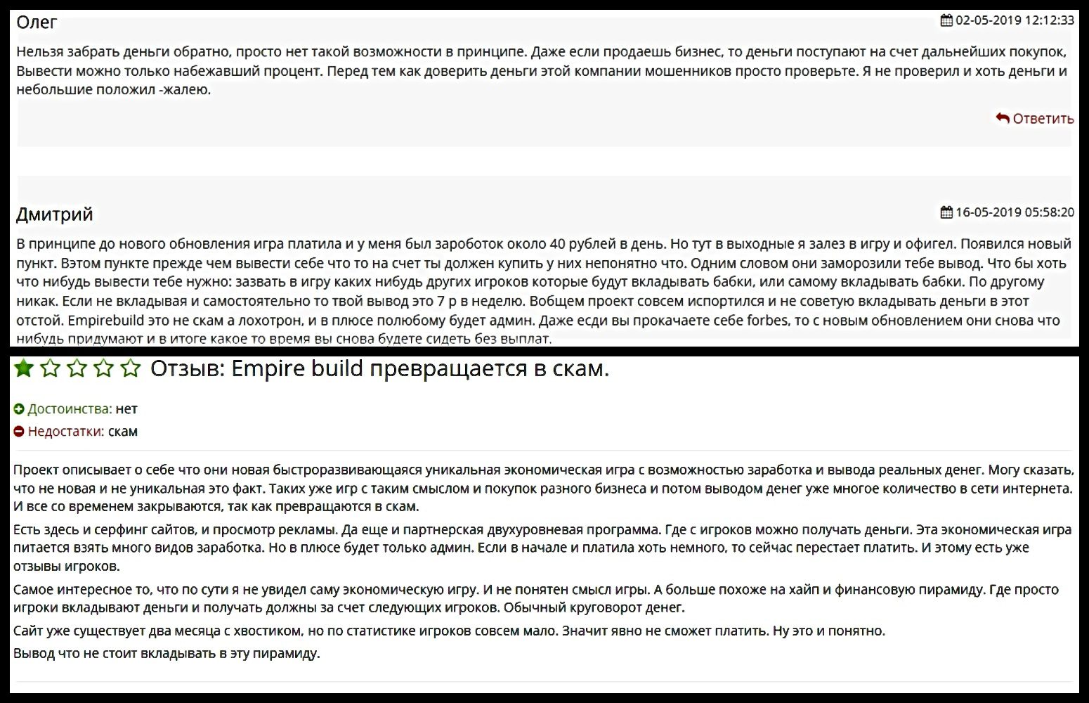 Модератор форума вложил в игру Empire Building порядка 6500 рублей, которые впоследствии якобы смог отбить и даже выйти в небольшой плюс. Верить выкладкам в принципе глупо — под видом добросовестного инвестора мог скрываться просто один из пиарщиков хайпа или кто-то из создателей.После ввода кэш-поинтов проект гарантированно ничего не платил, о чем говорят многочисленные отзывы о Эмпайр Билдинг. Задумка аферистов состояла в конвертации накоплений в оригинальной внутриигровой валюте MB в Forbes Point, итогом чего становилось уменьшение текущего баланса в 10 раз.