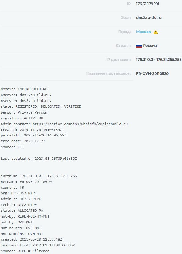Если проверить WHOIS empirebuild.ru, можно видеть данные о регистрации домена еще в 2004 году во Франции, после чего в 2019 году он переехал в Москву и был оплачен до ноября 2023. Сейчас сайт недоступен даже через VPN, как и другие зеркала ресурса в зонах .pro и .org.