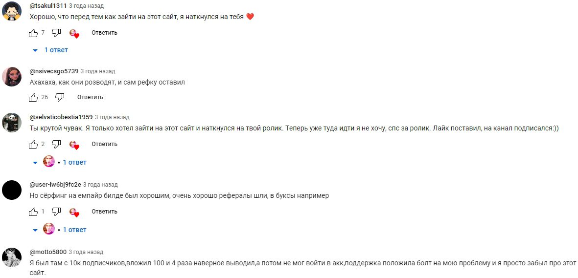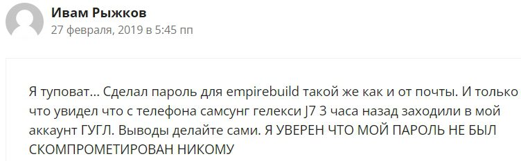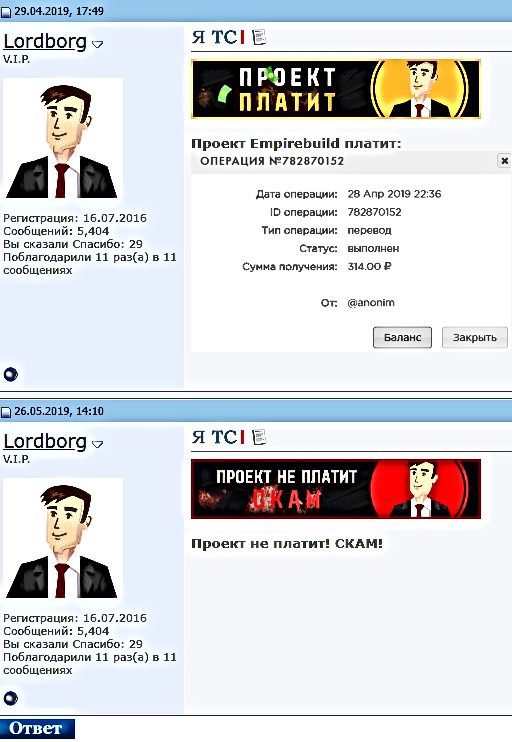 Хайпы под вывеской Empire Building Games — типичный пример онлайн-развода, основанного на заведомо лживой идее получения дохода из ниоткуда. Сбор фантиков с целью их предположительного обмена на реальные деньги приводит не только к финансовым проблемам, но и пустой трате времени, а итог инвестиций в аферы наподобие Эмпайр Билдинг всегда один — слив депозита в карманы аферистов. Если вы работали с empirebuild.ru или его клонами, отзыв об этом ждем в комментах.