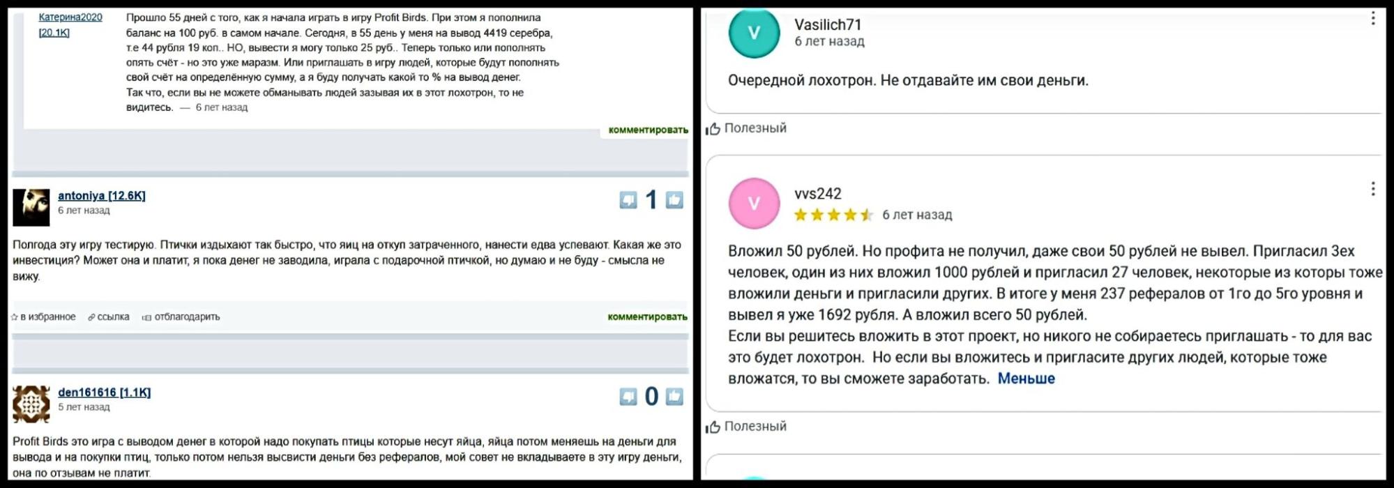 Этим временем датированы самые ранние отзывы о Profit Birds и онлайн-заработке с хайпом, судя по которым уже тогда счет жертв шел на десятки. Создатели псевдофинансовой игры с выводом денег Профит Бердс разводили на profit-birds.com, profitbirds.club и лендингах на схожих URL, а после обогащения на инвесторах бросали сайты и открывали новые с идентичным контентом.