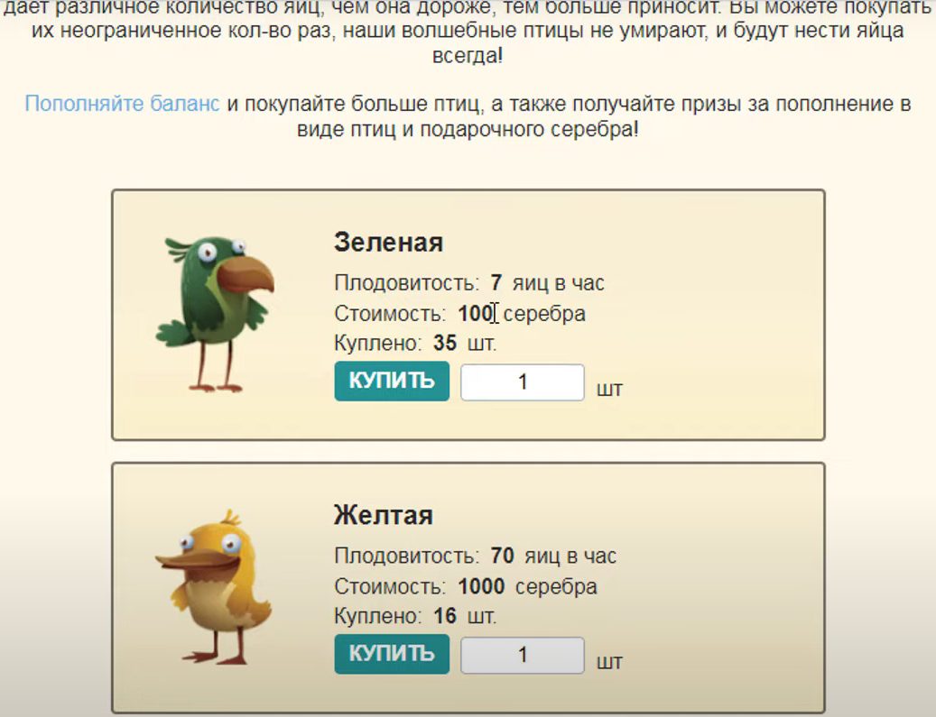Виртуальные питомцы Профит Бердс подразделяются на 5 категорий, а наиболее «доходный» персонаж обойдется юзеру в 1000 рублей. Единственный параметр рисованного уродца — «плодовитость», который описывает скорость производства «яиц» для добычи липового серебра.Курс внутриигровой валюты фиксирован и составляет 100:1, а перед предстоящим скамом анонимы применяют главный козырь — ввод «кэш-поинтов», которые потребуется набирать с помощью повышения активности по «партнерке». По легенде админов Профит Бердс, по достижении определенного минимума выводы «разморозятся», что является шаблонной уловкой для выманивания дополнительных денег.