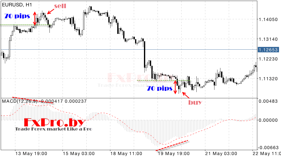 Ждем, когда индикатор MACD, покажет нам Конвергенцию, после чего находим максимум на индикаторе MACD, с которого началась Конвергенция, находим соответствующий максимум на цене и от него отсчитываем вверх 70 пунктов, после чего устанавливаем туда ордер Sell Limit на продажу. Когда цена подходит к активации нашего ордера, мы перепроверяем на индикаторе MACD, не исчезла или не обнулилась ли наша конвергенция, если индикатор MACD показывает что все хорошо, тогда ордер оставляем и ждем, когда он сработает.