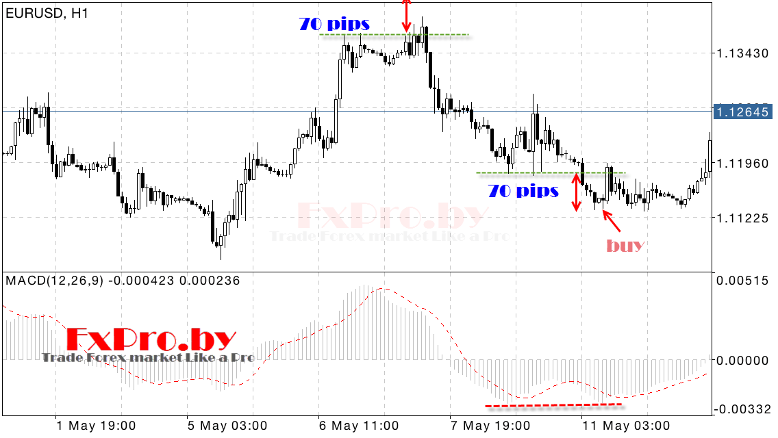 Ждем, когда индикатор MACD покажет нам Дивергенцию. После чего находим минимум на индикаторе MACD, с которого началась дивергенция, находим соответствующий минимум на цене и от него отсчитываем вниз 70 пунктов, после чего устанавливаем туда ордер Buy Limit на покупку. Когда цена подходит к активации нашего ордера, мы перепроверяем на индикаторе MACD, не исчезла или не обнулилась ли наша дивергенция, если индикатор MACD показывает что все хорошо, тогда ордер оставляем и ждем, когда он сработает.