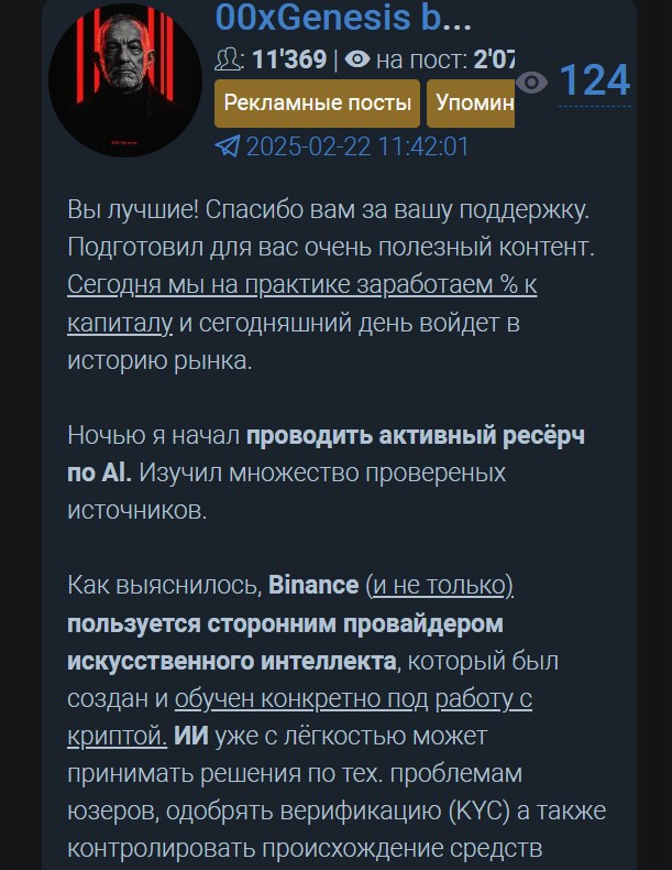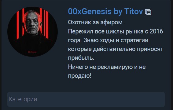 На канале 00xgenesis by Titov anti 11 000 подписчиков, из которых около 20% просматривают посты в сутки. Трейдер ведет анонимную деятельность, не показывает лицо, не называет свое реальное имя.