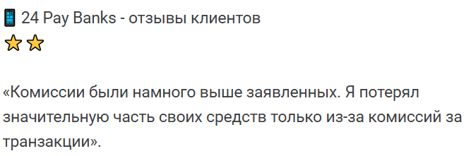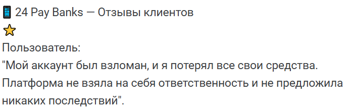 Исходя из собранной информации, и многочисленных жалоб пользователей, о которых говорят 24paybanks me отзывы, рекомендуем отнестись к платформе с осторожностью.