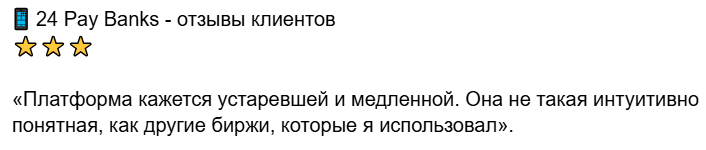 Простота — главное достоинство 24 paybank. В сети присутствуют примеры как позитивного, так и негативного опыта, но некоторые отзывы говорят о проблемах с интерфейсом, включая длительное время загрузки и отсутствие торговых инструментов для опытных трейдеров.Информация на платформе содержит сведения о низких комиссиях за транзакции в сравнении с другими контрагентами на рынке. Однако, на практике, комиссии за транзакции выше ожидаемых, особенно для небольших транзакций. Скрытые комиссии и неясные структуры стали предметом спора.