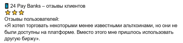 Платформа позиционирует себя как удобный сервис, который оперирует спектром цифровых активов. Хотя обменник 24paybank и поддерживает ряд популярных цифровых активов, как Bitcoin и Ethereum, выбор других альткоинов ограничен. Платформа не обладает широким диапазоном торговых пар, как конкуренты, и не поддерживает новые нишевые криптовалюты.