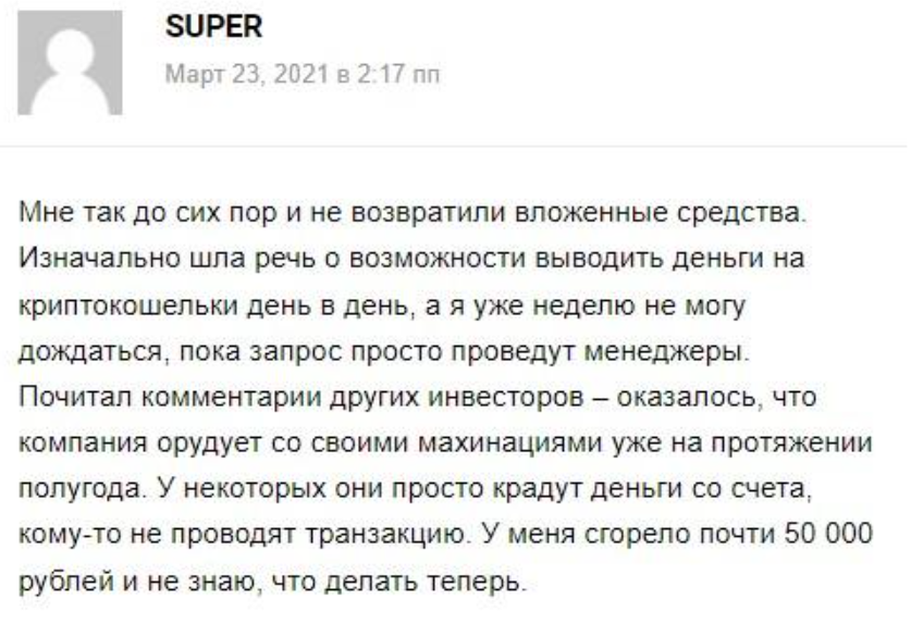 Конкретика встречается в отрицательных отзывах о 24 Profit. Многие инвесторы жалуются на то, что предлагаемые сервисом механизмы оказываются проигрышными. А еще – на вывод денег. Он попросту невозможен. То служба поддержки перестает отвечать или дает шаблонные отписки на жалобы, то платежи «зависают». А тех, кто слишком активно пытаются докопаться до истины, попросту блокируют.