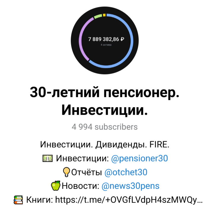 В дополнение к основному каналу 30-летний пенсионер доступно сообщество в ТГ Книги Инвестора. Его можно найти по ссылке t me/+OVGfLVdpH4szMWQy. Канал работает еще с 28 ноября 2022-го и ориентирован только на литературу.