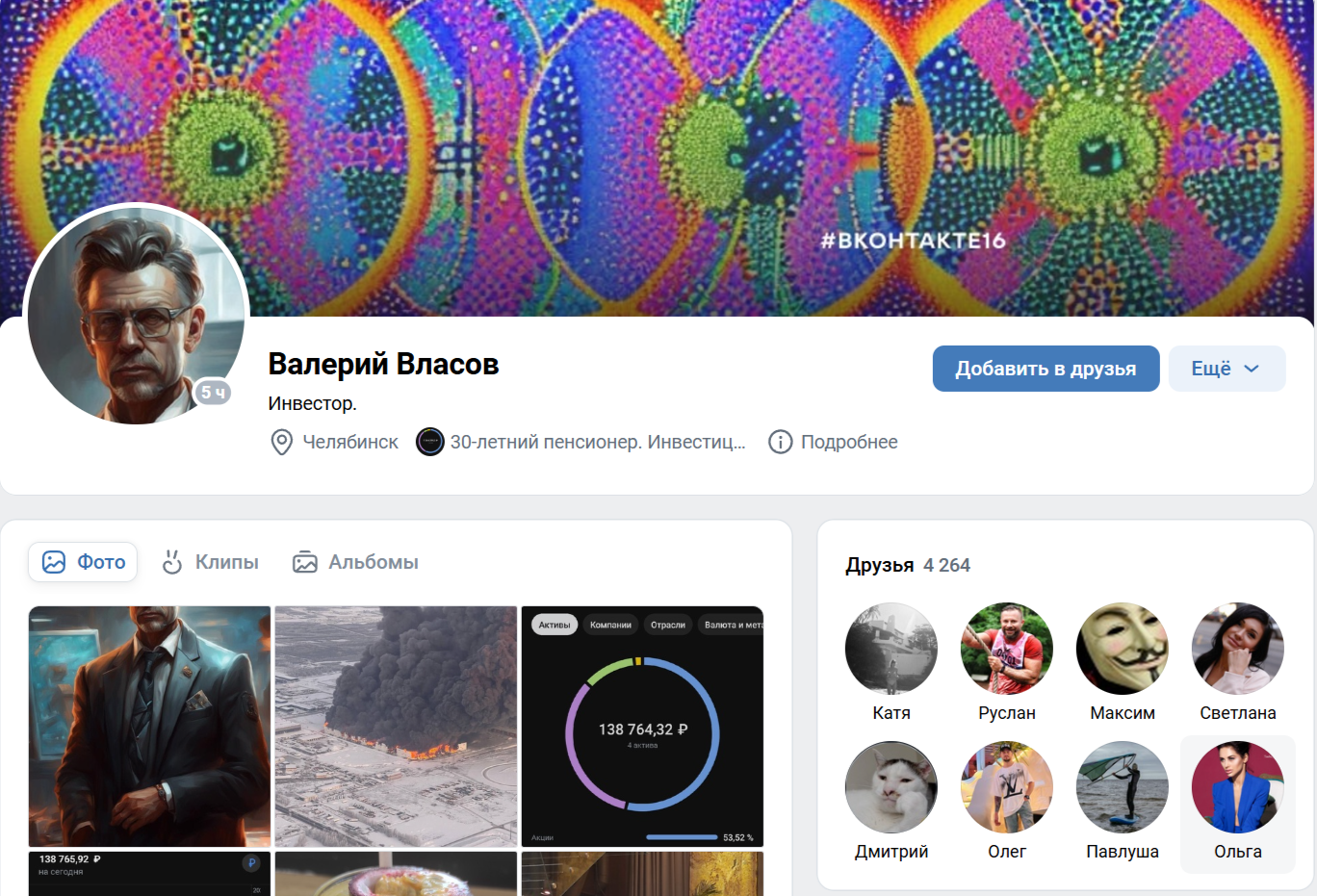 В качестве подтверждения квалификации доступен профиль 30letniy pensioner в Пульсе (сегодня — TBank). Здесь у героя материала около 23 тыс. фолловеров, но сам он не слишком активно подписывается к другим участникам. Заявленная доходность составляет 146% за последний период или 3.9% за год. Размер портфеля — до 10 млн. рублей. Общее число сделок за месяц — около 75.У героя материала есть профиль в ВК, который доступен по ссылке Tes Electron. Здесь сказано, что Валерий родился 1 сентября 1989 года. Он не женат и проживает в г. Челябинск. В детском возрасте будущий инвестор учился в Гимназии №1 в период с 1997-го по 2007-й.
