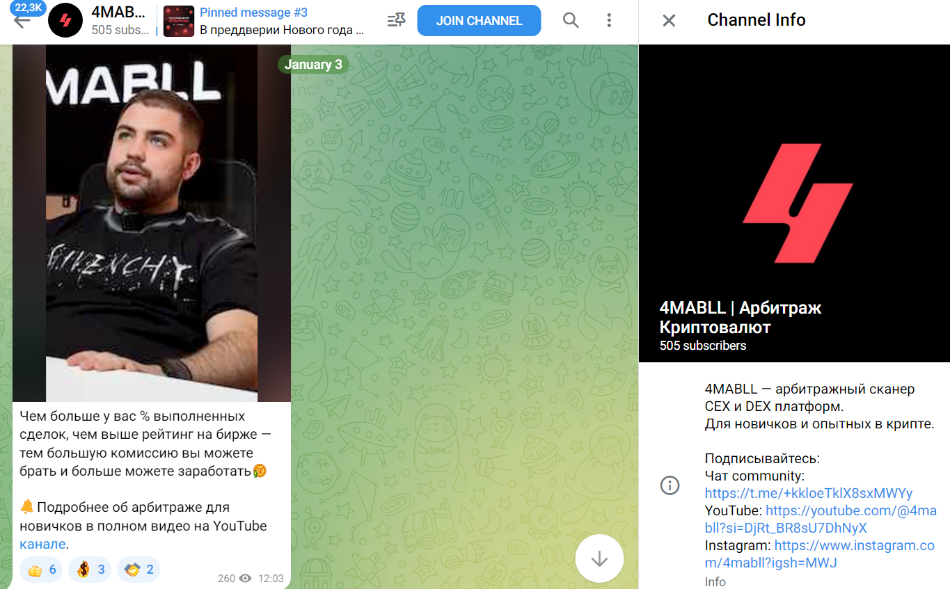 Телеграмм канал 4MABLL Арбитраж Криптовалют функционирует с апреля 2024 года. На момент написания статьи здесь 505 подписчиков.