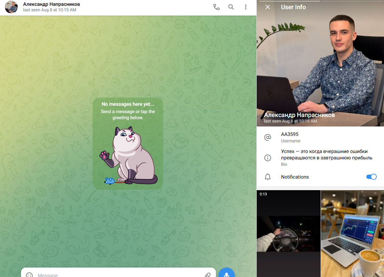 В своем био автор отмечает, что успех это превращение ошибок в прибыль, чем подталкивает клиентов идти на риск. Сам Александр якобы занимается трейдингом, о чем говорят красивые публикации в профиле, однако поиск информации в сети показал, что они были взяты из других социальных сетей / стоковых сайтов и не принадлежат ему. Помимо этого ролики роскошной жизни также были украдены, а инвестор лишь пытался такими действиями привлечь наивных клиентов.