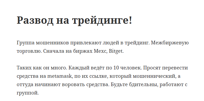 Никаких каналов в телеграм AA3595 не ведет, а поиск сторонних социальных сетей Александра не дал результатов, что достаточно странно. Возможно реальные владельцы профиля просто украли чужие фотографии и уникализировали их. Связываться с трейдером также бесполезно, ведь он ищет людей самостоятельно и предлагает выгодные вложения на якобы официальных биржах.По словам некоторых пользователей, Александр работает не один, а с некой Викторией Наумовой, которая предварительно прогревает аудиторию перед вложениями в приватных группах по 10 человек. Сам трейдер нередко меняет логин профиля. Несмотря на заявления о работе с проверенными платформами, в лице MEXC / BingX, команда трейдера предлагает вносить депозит не через личный кабинет на бирже, а через кошелек Metamask.