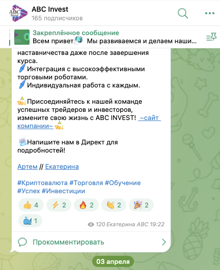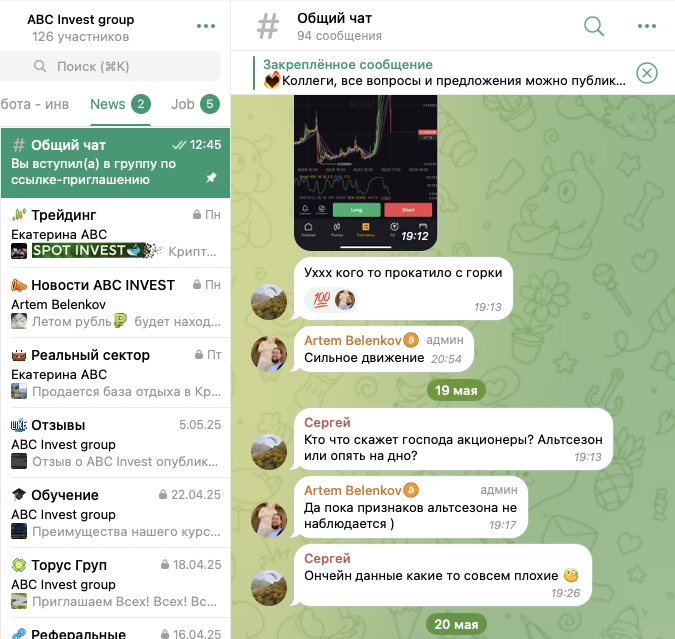 Также в Telegram есть чат — ABC Invest group. В нем состоит 126 участников. Активность в лентах различных категорий данного сообщества слабая. По сообщениям участников комьюнити видно, что большая их часть абсолютные новички в трейдинге.