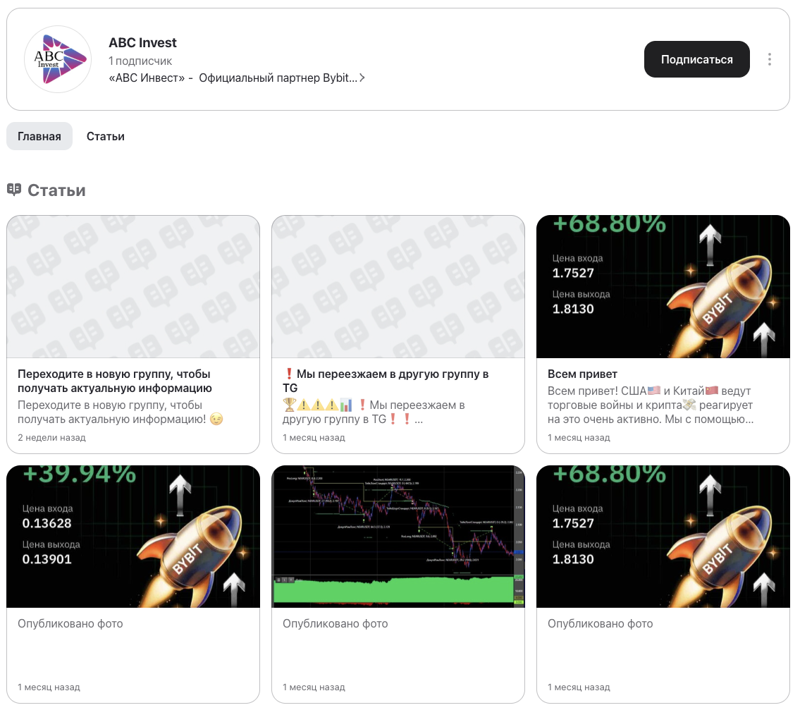 А на странице ABC Invest, ABCInvest в «Дзен» вовсе один подписчик. Контент в этом аккаунте — результаты торговых сделок. Однако, данные скриншоты ни о чем не говорят. Основатели проекта вполне могут скрывать сведения об убыточных сделках.
