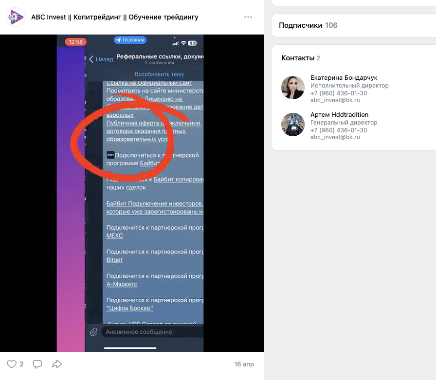 На страницу «ABC Invest Копитрейдинг Обучение трейдингу», abc traid во «ВКонтакте» подписано 106 пользователей. Публикации в ленте данного аккаунта получают всего по 1-3 лайка.