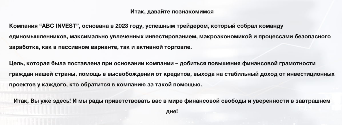 «АБС Инвест» — краснодарская школа трейдинга, которая была основана в 2023-ем году. Заявлено, что она создана «успешным трейдером». Однако, насколько высоких результатов ему удалось достичь, информации нет.