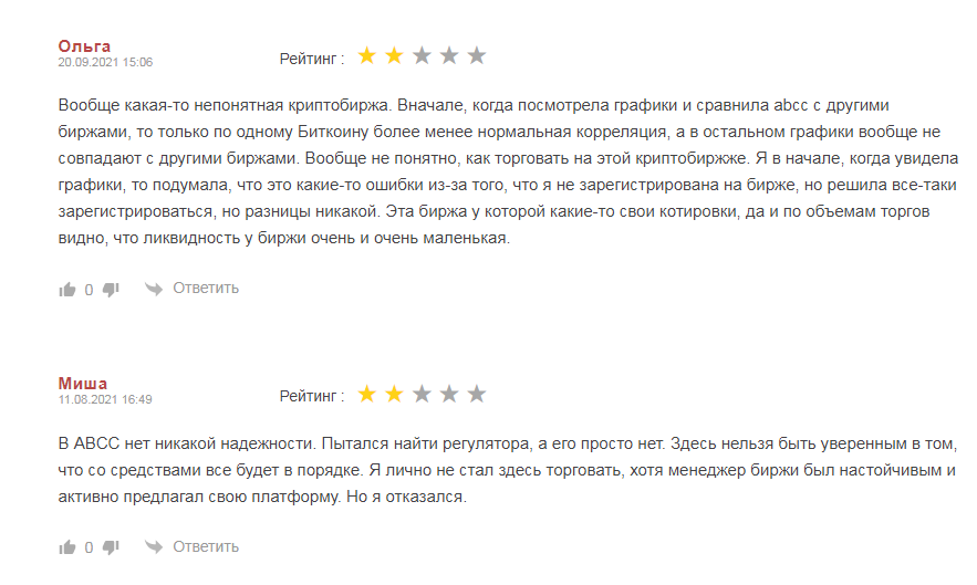 О бирже криптовалют ABCC в сети много негативных отзывов. Пользователи жалуются на то, что столкнулись с проблемами при торговле на этой площадке. По их словам, котировки здесь отличаются от котировок на других биржах, что может указывать на обман. Трейдеры подчеркивают, что есть вопросы к юридической стороне. Доверия биржа, которая никем не регулируется, не вызывает.