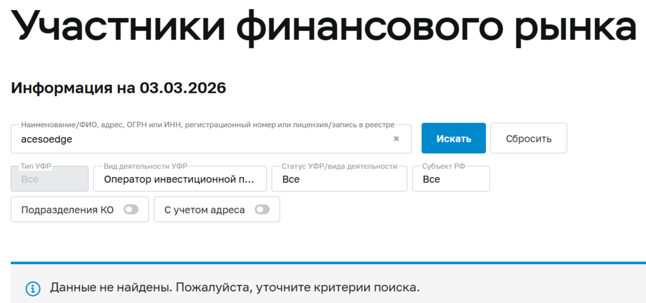 Согласно отзывам, Acesoedge Com – инвестиционная платформа, работающая без лицензии финансового регулятора. Это означает, что нет контроля со стороны официальных надзорных органов. На сайте легальных площадок обязательно размещается номер лицензии и страна регистрации. У данного сервиса нет этих данных.