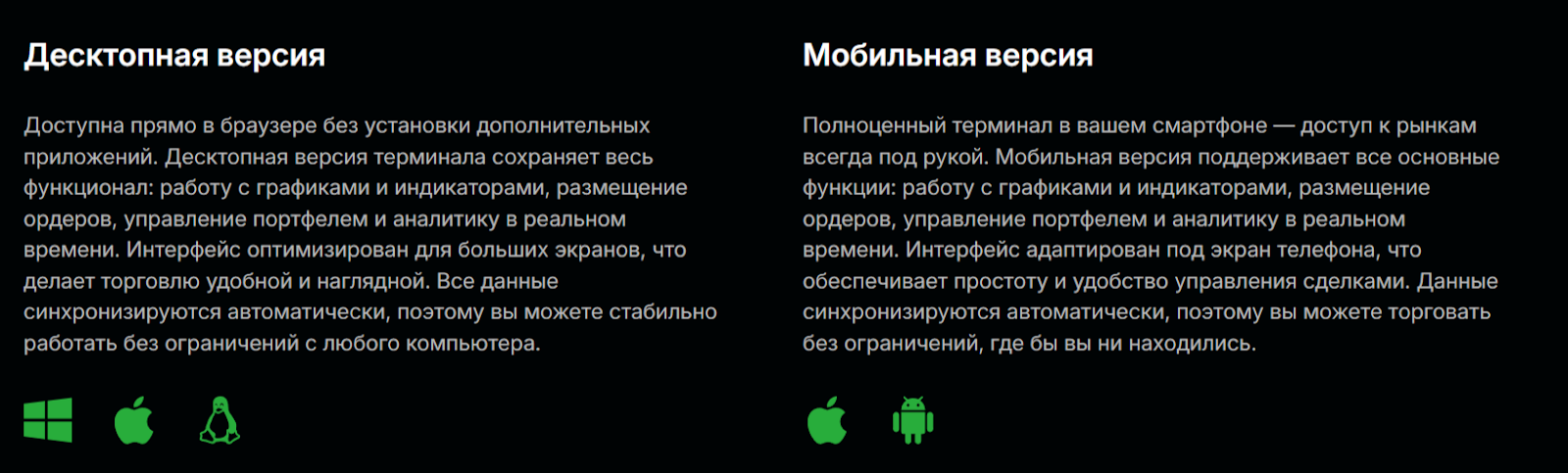 На платформе «Ацесоедж» доступны разные ордера: рыночный, лимитный, стоп-ордер, стоп-лосс, тейк-профит и трейлинг-стоп. Терминал работает в браузере и мобильной версии. Клиентам предлагается синхронизация данных и инструментов технического анализа.