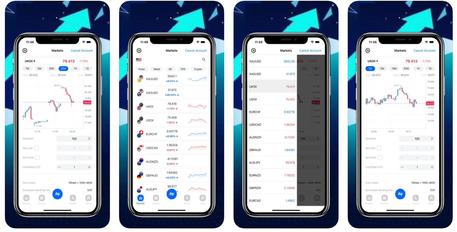 После входа в приложение Acmj клиентам открывается доступ к рынку. Для этого достаточно нажать на кнопку Markets. Вниз также представлено несколько разделов, которые ведут к следующим категориям: